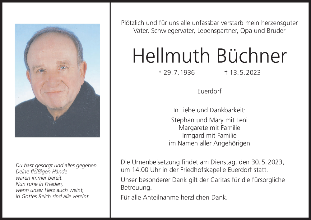 Hier finden Sie alle Traueranzeigen aus der Zeitung, die bisher für Hellmuth Büchner erschienen sind. Weitere Traueranzeigen, die in der Zeitung erscheinen, werden hier ebenfalls aufgelistet