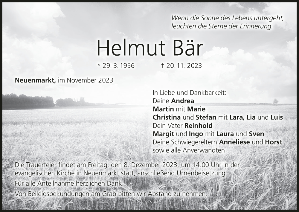 Hier finden Sie alle Traueranzeigen aus der Zeitung, die bisher für Helmut Bär erschienen sind. Weitere Traueranzeigen, die in der Zeitung erscheinen, werden hier ebenfalls aufgelistet