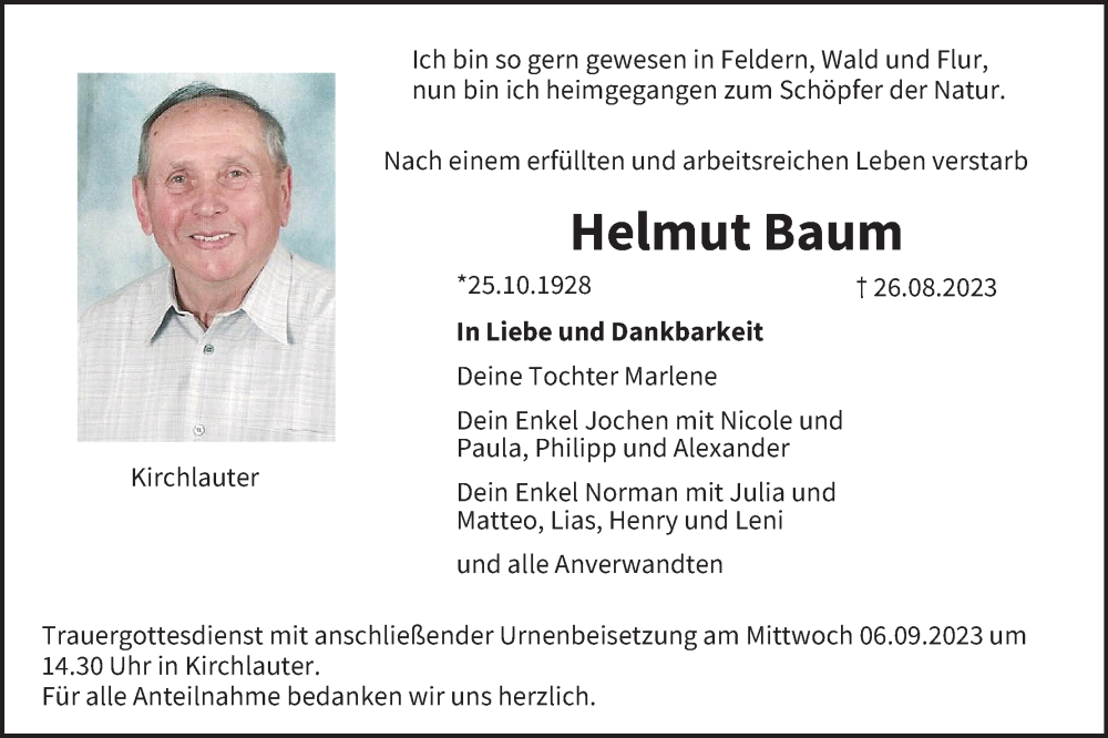 Hier finden Sie alle Traueranzeigen aus der Zeitung, die bisher für Helmut Baum erschienen sind. Weitere Traueranzeigen, die in der Zeitung erscheinen, werden hier ebenfalls aufgelistet