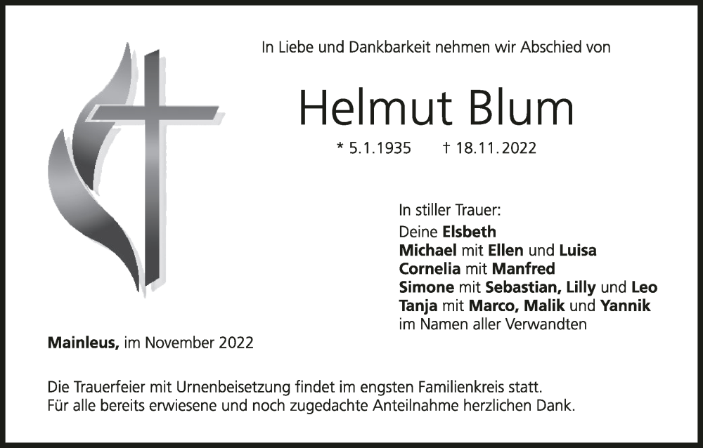 Hier finden Sie alle Traueranzeigen aus der Zeitung, die bisher für Helmut Blum erschienen sind. Weitere Traueranzeigen, die in der Zeitung erscheinen, werden hier ebenfalls aufgelistet