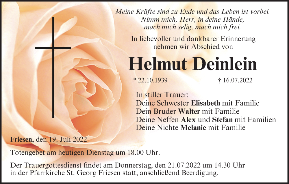 Hier finden Sie alle Traueranzeigen aus der Zeitung, die bisher für Helmut Deinlein erschienen sind. Weitere Traueranzeigen, die in der Zeitung erscheinen, werden hier ebenfalls aufgelistet