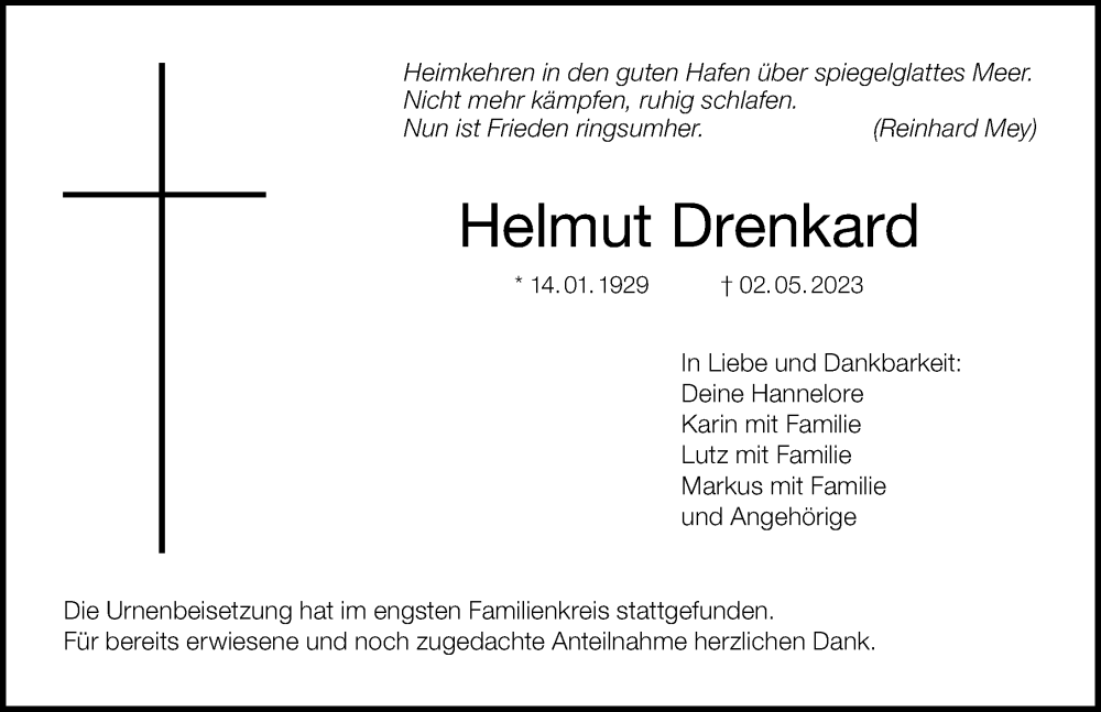Hier finden Sie alle Traueranzeigen aus der Zeitung, die bisher für Helmut Drenkard erschienen sind. Weitere Traueranzeigen, die in der Zeitung erscheinen, werden hier ebenfalls aufgelistet