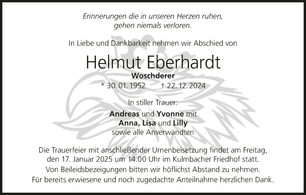Hier finden Sie alle Traueranzeigen aus der Zeitung, die bisher für Helmut Eberhardt erschienen sind. Weitere Traueranzeigen, die in der Zeitung erscheinen, werden hier ebenfalls aufgelistet