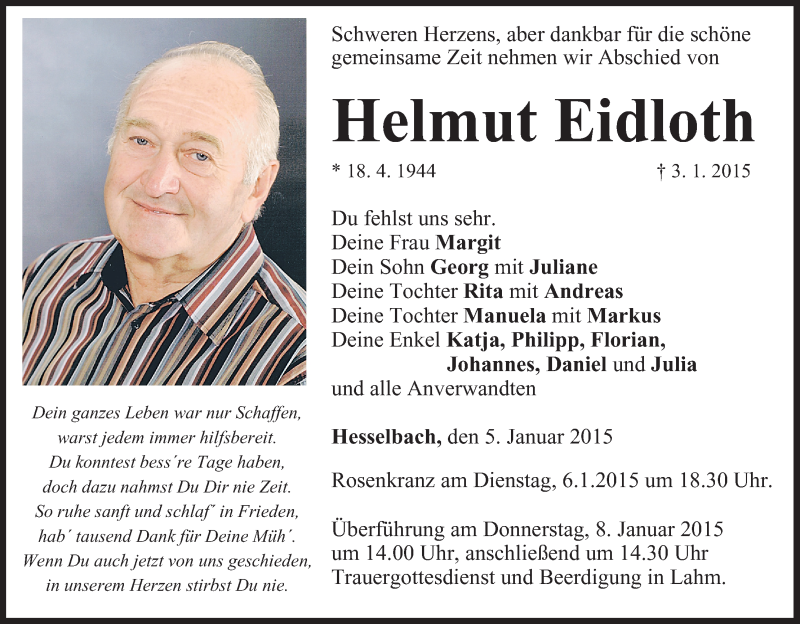 Hier finden Sie alle Traueranzeigen aus der Zeitung, die bisher für Helmut Eidloth erschienen sind. Weitere Traueranzeigen, die in der Zeitung erscheinen, werden hier ebenfalls aufgelistet