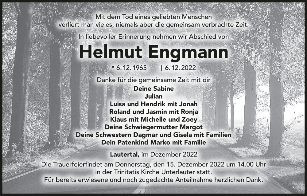Hier finden Sie alle Traueranzeigen aus der Zeitung, die bisher für Helmut Engmann erschienen sind. Weitere Traueranzeigen, die in der Zeitung erscheinen, werden hier ebenfalls aufgelistet