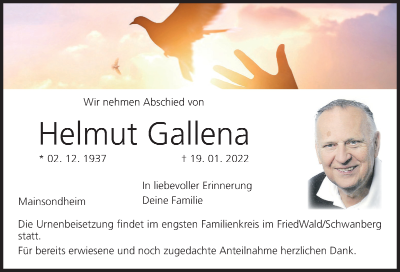 Hier finden Sie alle Traueranzeigen aus der Zeitung, die bisher für Helmut Gallena erschienen sind. Weitere Traueranzeigen, die in der Zeitung erscheinen, werden hier ebenfalls aufgelistet