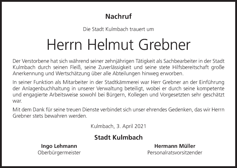 Hier finden Sie alle Traueranzeigen aus der Zeitung, die bisher für Helmut Grebner erschienen sind. Weitere Traueranzeigen, die in der Zeitung erscheinen, werden hier ebenfalls aufgelistet