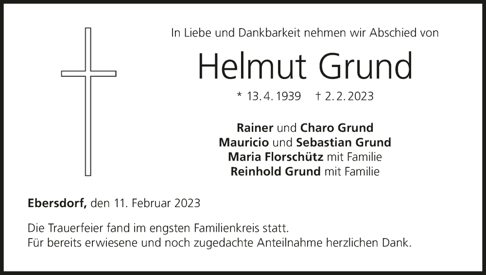 Hier finden Sie alle Traueranzeigen aus der Zeitung, die bisher für Helmut Grund erschienen sind. Weitere Traueranzeigen, die in der Zeitung erscheinen, werden hier ebenfalls aufgelistet