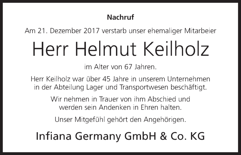 Hier finden Sie alle Traueranzeigen aus der Zeitung, die bisher für Helmut Keilholz erschienen sind. Weitere Traueranzeigen, die in der Zeitung erscheinen, werden hier ebenfalls aufgelistet