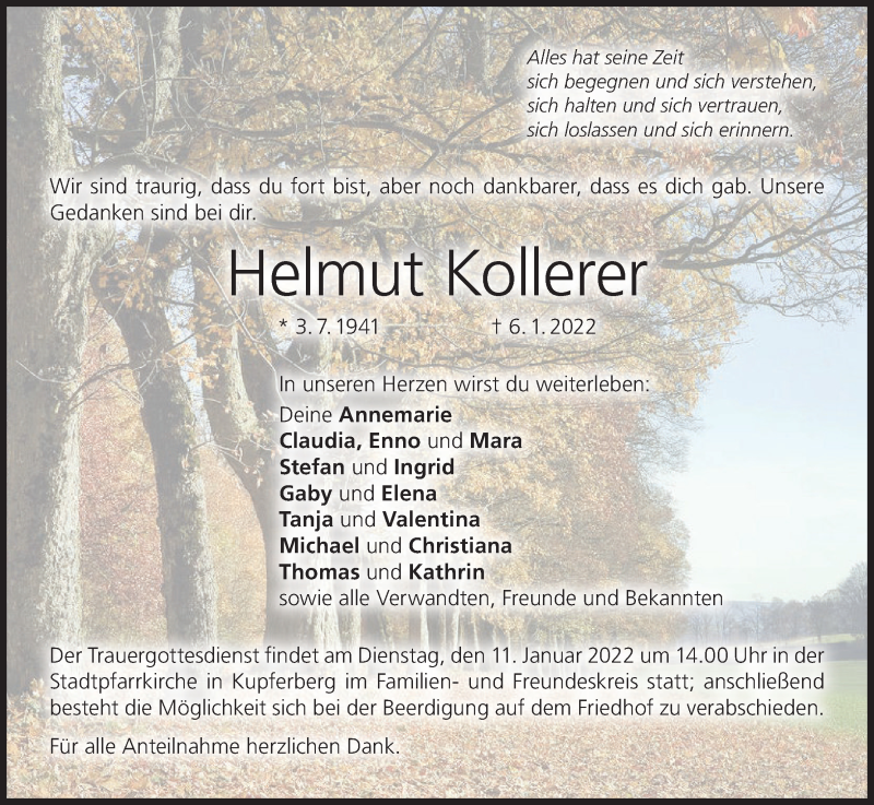 Hier finden Sie alle Traueranzeigen aus der Zeitung, die bisher für Helmut Kollerer erschienen sind. Weitere Traueranzeigen, die in der Zeitung erscheinen, werden hier ebenfalls aufgelistet