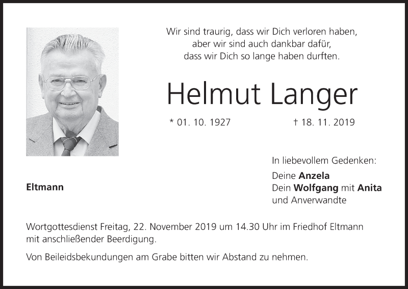 Hier finden Sie alle Traueranzeigen aus der Zeitung, die bisher für Helmut Langer erschienen sind. Weitere Traueranzeigen, die in der Zeitung erscheinen, werden hier ebenfalls aufgelistet