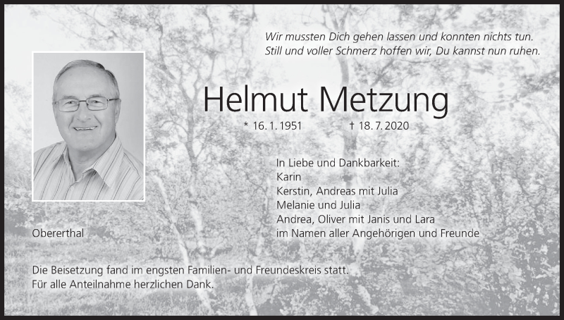 Hier finden Sie alle Traueranzeigen aus der Zeitung, die bisher für Helmut Metzung erschienen sind. Weitere Traueranzeigen, die in der Zeitung erscheinen, werden hier ebenfalls aufgelistet