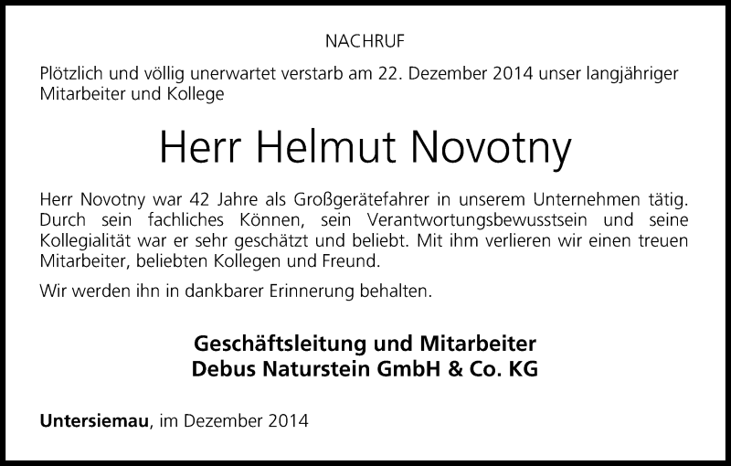 Hier finden Sie alle Traueranzeigen aus der Zeitung, die bisher für Helmut Novotny erschienen sind. Weitere Traueranzeigen, die in der Zeitung erscheinen, werden hier ebenfalls aufgelistet