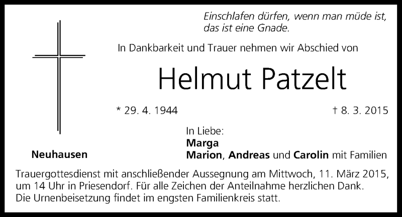 Hier finden Sie alle Traueranzeigen aus der Zeitung, die bisher für Helmut Patzelt erschienen sind. Weitere Traueranzeigen, die in der Zeitung erscheinen, werden hier ebenfalls aufgelistet