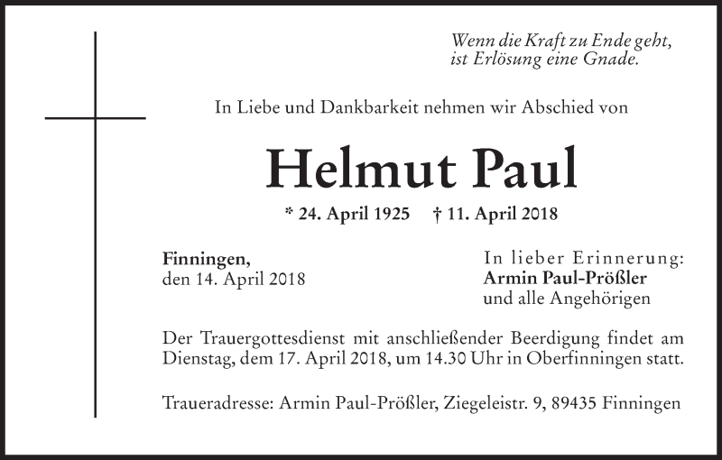 Hier finden Sie alle Traueranzeigen aus der Zeitung, die bisher für Helmut Paul erschienen sind. Weitere Traueranzeigen, die in der Zeitung erscheinen, werden hier ebenfalls aufgelistet