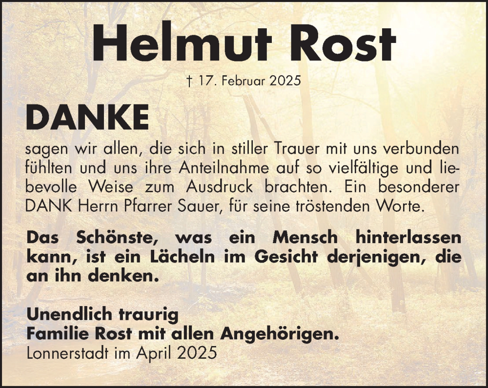 Hier finden Sie alle Traueranzeigen aus der Zeitung, die bisher für Helmut Rost erschienen sind. Weitere Traueranzeigen, die in der Zeitung erscheinen, werden hier ebenfalls aufgelistet