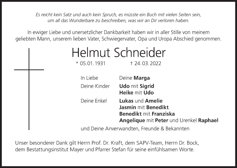 Hier finden Sie alle Traueranzeigen aus der Zeitung, die bisher für Helmut Schneider erschienen sind. Weitere Traueranzeigen, die in der Zeitung erscheinen, werden hier ebenfalls aufgelistet
