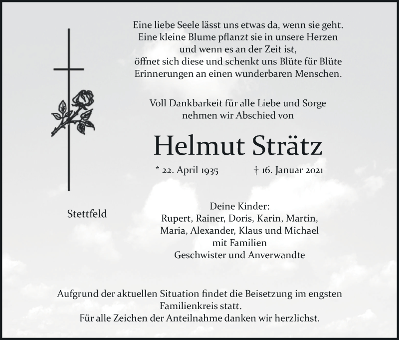 Hier finden Sie alle Traueranzeigen aus der Zeitung, die bisher für Helmut Strätz erschienen sind. Weitere Traueranzeigen, die in der Zeitung erscheinen, werden hier ebenfalls aufgelistet