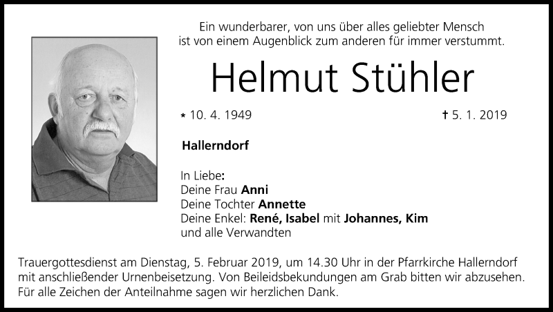 Hier finden Sie alle Traueranzeigen aus der Zeitung, die bisher für Helmut Stühler erschienen sind. Weitere Traueranzeigen, die in der Zeitung erscheinen, werden hier ebenfalls aufgelistet