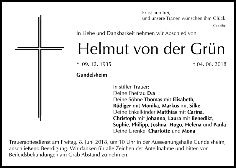 Hier finden Sie alle Traueranzeigen aus der Zeitung, die bisher für Helmut von der Grün erschienen sind. Weitere Traueranzeigen, die in der Zeitung erscheinen, werden hier ebenfalls aufgelistet