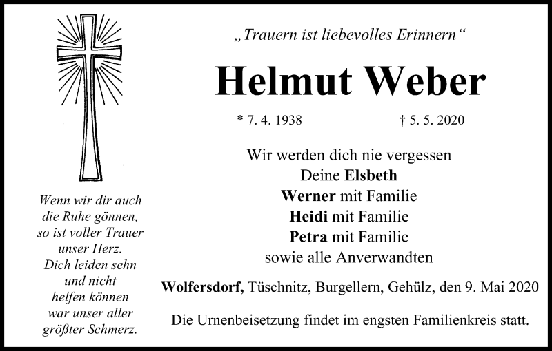 Hier finden Sie alle Traueranzeigen aus der Zeitung, die bisher für Helmut Weber erschienen sind. Weitere Traueranzeigen, die in der Zeitung erscheinen, werden hier ebenfalls aufgelistet