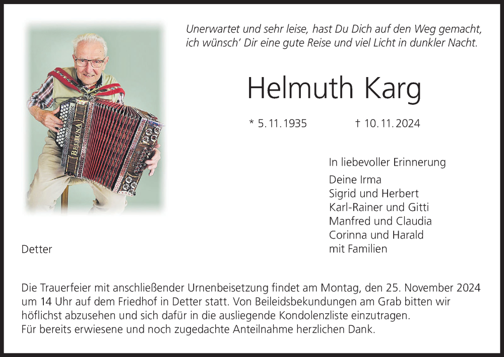 Hier finden Sie alle Traueranzeigen aus der Zeitung, die bisher für Helmuth Karg erschienen sind. Weitere Traueranzeigen, die in der Zeitung erscheinen, werden hier ebenfalls aufgelistet