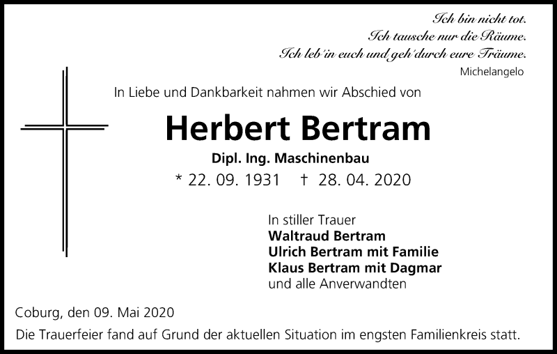 Hier finden Sie alle Traueranzeigen aus der Zeitung, die bisher für Herbert Bertram erschienen sind. Weitere Traueranzeigen, die in der Zeitung erscheinen, werden hier ebenfalls aufgelistet