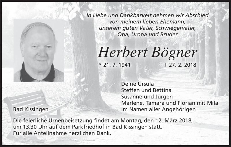 Hier finden Sie alle Traueranzeigen aus der Zeitung, die bisher für Herbert Bögner erschienen sind. Weitere Traueranzeigen, die in der Zeitung erscheinen, werden hier ebenfalls aufgelistet