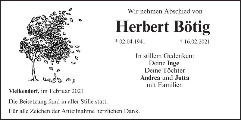 Hier finden Sie alle Traueranzeigen aus der Zeitung, die bisher für Herbert Bötig erschienen sind. Weitere Traueranzeigen, die in der Zeitung erscheinen, werden hier ebenfalls aufgelistet
