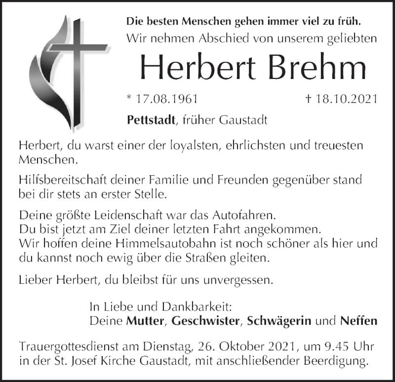 Hier finden Sie alle Traueranzeigen aus der Zeitung, die bisher für Herbert Brehm erschienen sind. Weitere Traueranzeigen, die in der Zeitung erscheinen, werden hier ebenfalls aufgelistet