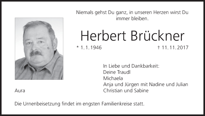 Hier finden Sie alle Traueranzeigen aus der Zeitung, die bisher für Herbert Brückner erschienen sind. Weitere Traueranzeigen, die in der Zeitung erscheinen, werden hier ebenfalls aufgelistet