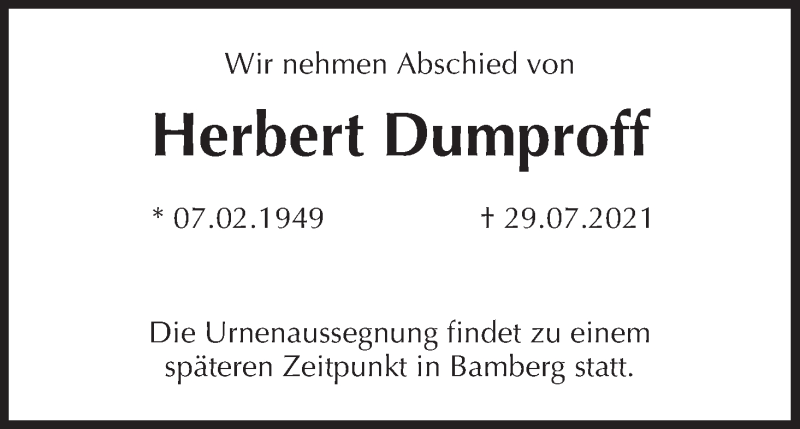 Hier finden Sie alle Traueranzeigen aus der Zeitung, die bisher für Herbert Dumproff erschienen sind. Weitere Traueranzeigen, die in der Zeitung erscheinen, werden hier ebenfalls aufgelistet