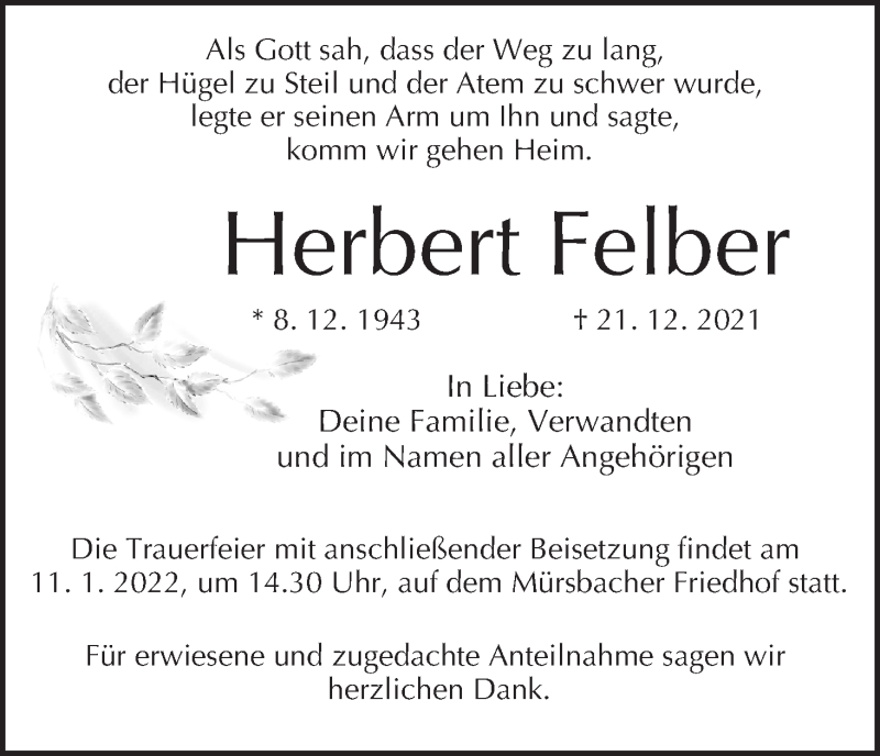 Hier finden Sie alle Traueranzeigen aus der Zeitung, die bisher für Herbert Felber erschienen sind. Weitere Traueranzeigen, die in der Zeitung erscheinen, werden hier ebenfalls aufgelistet