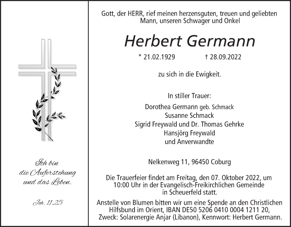 Hier finden Sie alle Traueranzeigen aus der Zeitung, die bisher für Herbert Germann erschienen sind. Weitere Traueranzeigen, die in der Zeitung erscheinen, werden hier ebenfalls aufgelistet