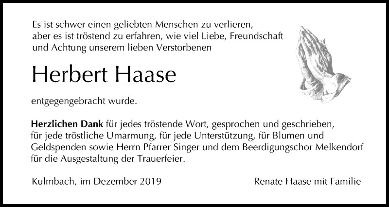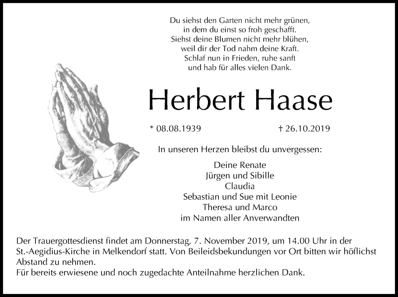 Hier finden Sie alle Traueranzeigen aus der Zeitung, die bisher für Herbert Haase erschienen sind. Weitere Traueranzeigen, die in der Zeitung erscheinen, werden hier ebenfalls aufgelistet
