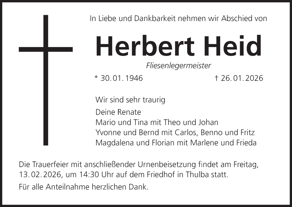 Hier finden Sie alle Traueranzeigen aus der Zeitung, die bisher für Herbert Heid erschienen sind. Weitere Traueranzeigen, die in der Zeitung erscheinen, werden hier ebenfalls aufgelistet