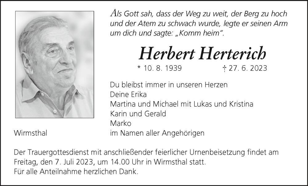 Hier finden Sie alle Traueranzeigen aus der Zeitung, die bisher für Herbert Herterich erschienen sind. Weitere Traueranzeigen, die in der Zeitung erscheinen, werden hier ebenfalls aufgelistet