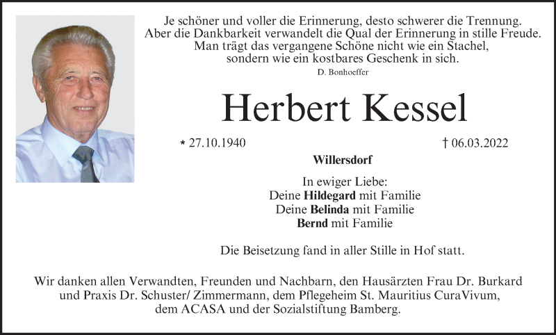 Hier finden Sie alle Traueranzeigen aus der Zeitung, die bisher für Herbert Kessel erschienen sind. Weitere Traueranzeigen, die in der Zeitung erscheinen, werden hier ebenfalls aufgelistet