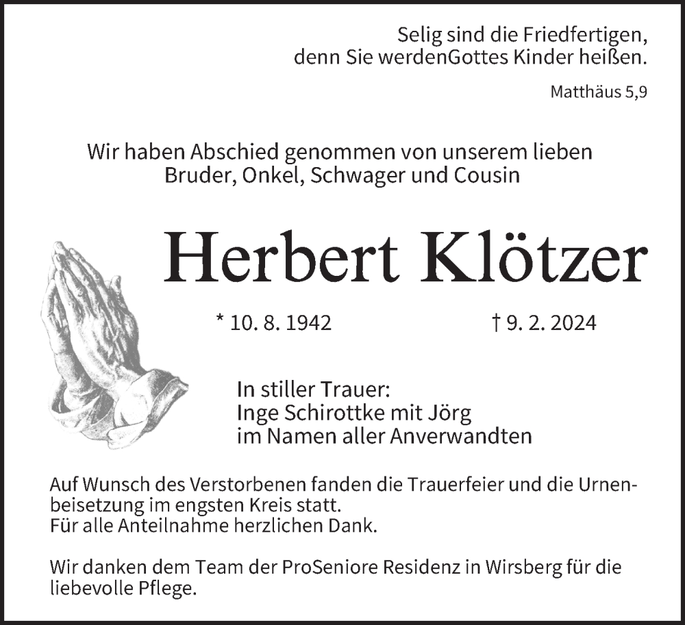 Hier finden Sie alle Traueranzeigen aus der Zeitung, die bisher für Herbert Klötzer erschienen sind. Weitere Traueranzeigen, die in der Zeitung erscheinen, werden hier ebenfalls aufgelistet