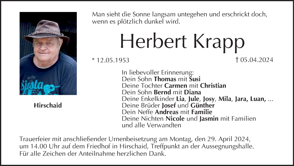 Hier finden Sie alle Traueranzeigen aus der Zeitung, die bisher für Herbert Krapp erschienen sind. Weitere Traueranzeigen, die in der Zeitung erscheinen, werden hier ebenfalls aufgelistet