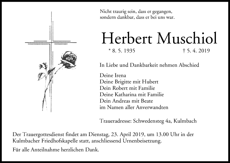 Hier finden Sie alle Traueranzeigen aus der Zeitung, die bisher für Herbert Muschiol erschienen sind. Weitere Traueranzeigen, die in der Zeitung erscheinen, werden hier ebenfalls aufgelistet