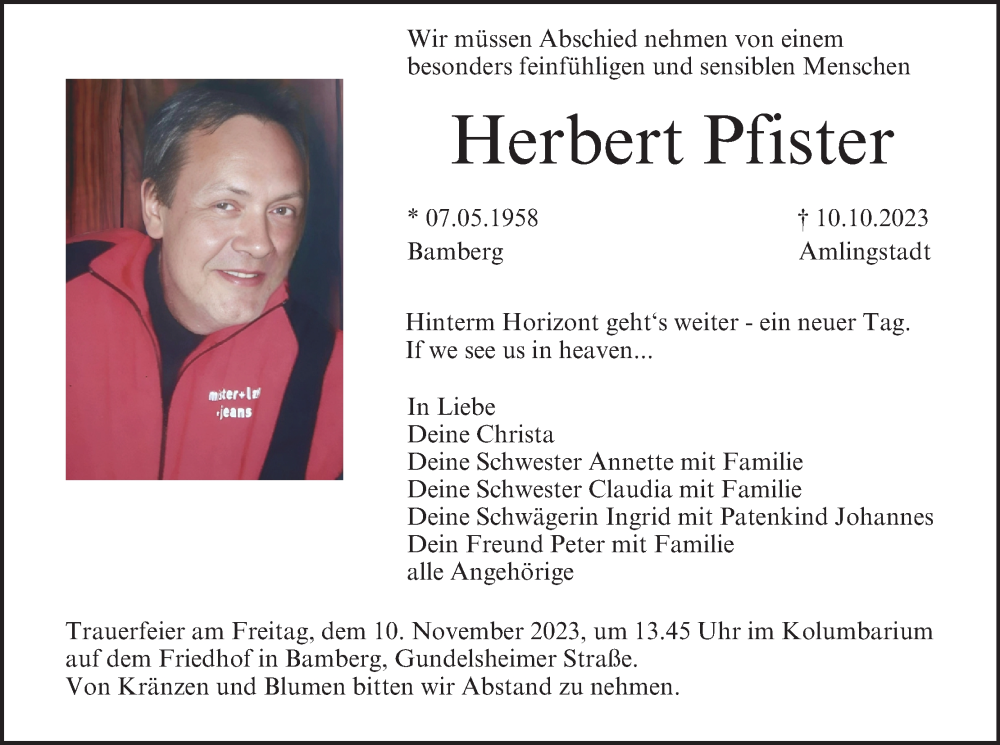 Hier finden Sie alle Traueranzeigen aus der Zeitung, die bisher für Herbert Pfister erschienen sind. Weitere Traueranzeigen, die in der Zeitung erscheinen, werden hier ebenfalls aufgelistet