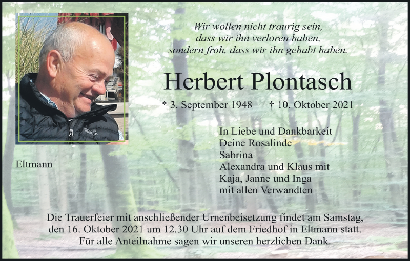 Hier finden Sie alle Traueranzeigen aus der Zeitung, die bisher für Herbert Plontasch erschienen sind. Weitere Traueranzeigen, die in der Zeitung erscheinen, werden hier ebenfalls aufgelistet