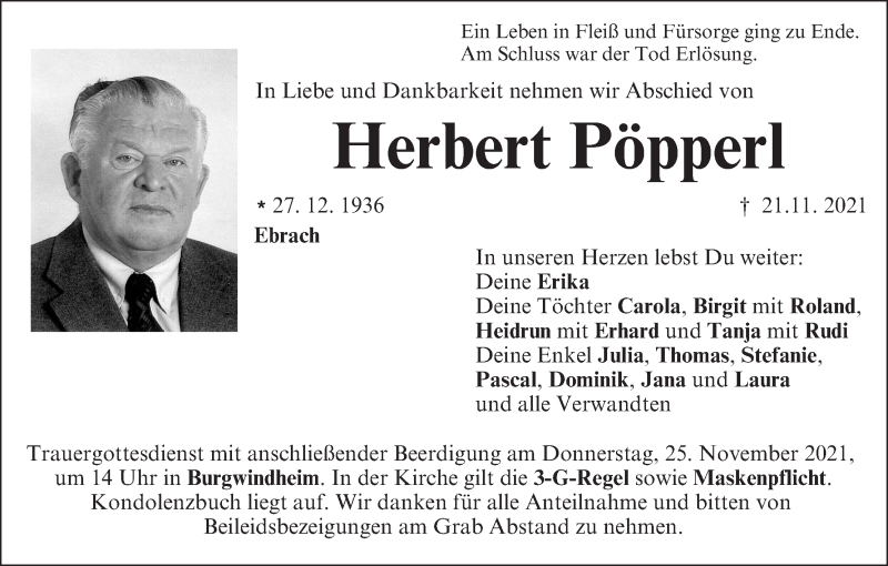 Hier finden Sie alle Traueranzeigen aus der Zeitung, die bisher für Herbert Pöpperl erschienen sind. Weitere Traueranzeigen, die in der Zeitung erscheinen, werden hier ebenfalls aufgelistet