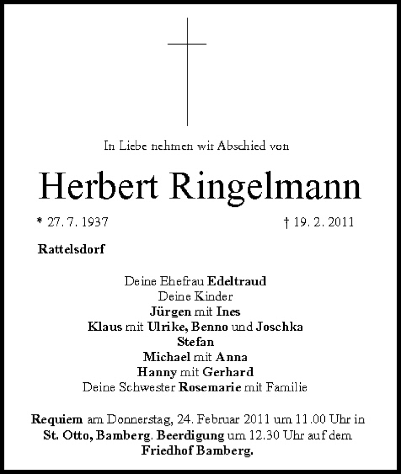 Hier finden Sie alle Traueranzeigen aus der Zeitung, die bisher für Herbert Ringelmann erschienen sind. Weitere Traueranzeigen, die in der Zeitung erscheinen, werden hier ebenfalls aufgelistet