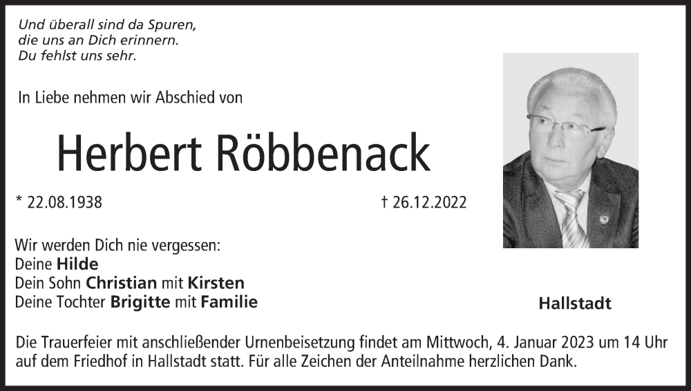Hier finden Sie alle Traueranzeigen aus der Zeitung, die bisher für Herbert Röbbenack erschienen sind. Weitere Traueranzeigen, die in der Zeitung erscheinen, werden hier ebenfalls aufgelistet