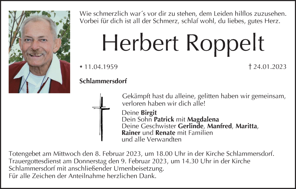 Hier finden Sie alle Traueranzeigen aus der Zeitung, die bisher für Herbert Roppelt erschienen sind. Weitere Traueranzeigen, die in der Zeitung erscheinen, werden hier ebenfalls aufgelistet