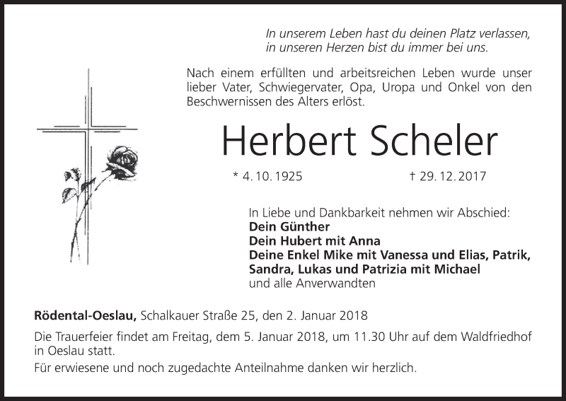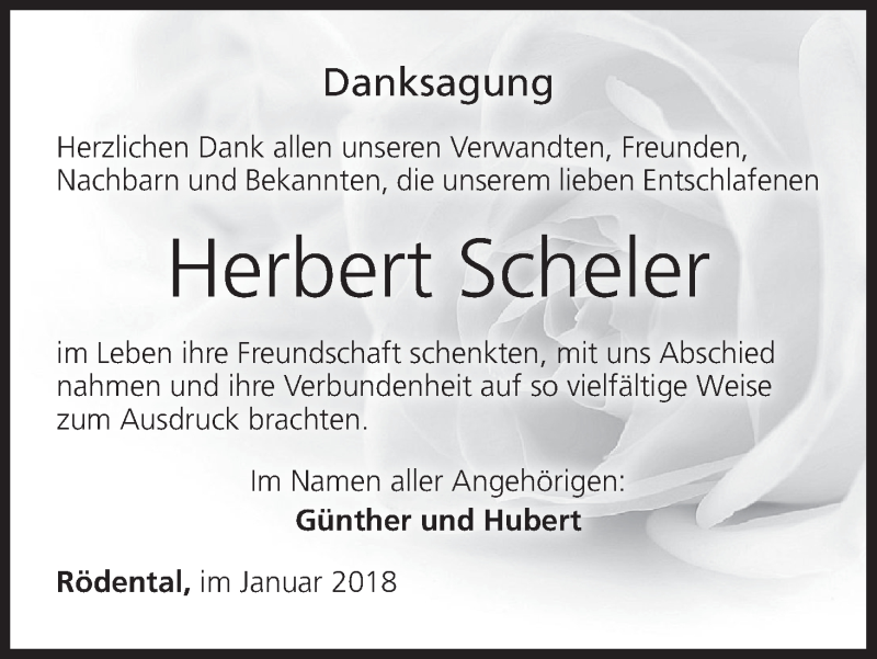Hier finden Sie alle Traueranzeigen aus der Zeitung, die bisher für Herbert Scheler erschienen sind. Weitere Traueranzeigen, die in der Zeitung erscheinen, werden hier ebenfalls aufgelistet