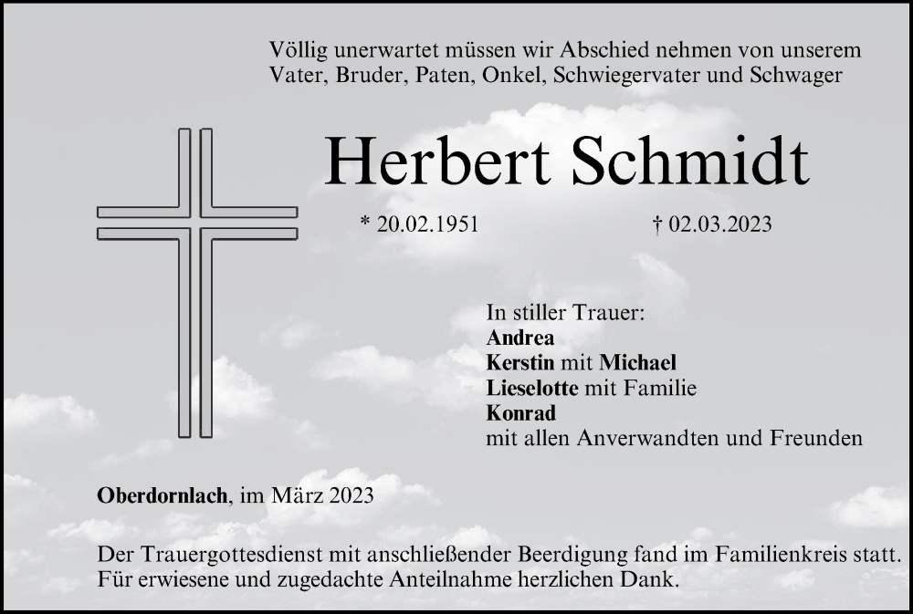 Hier finden Sie alle Traueranzeigen aus der Zeitung, die bisher für Herbert Schmidt erschienen sind. Weitere Traueranzeigen, die in der Zeitung erscheinen, werden hier ebenfalls aufgelistet