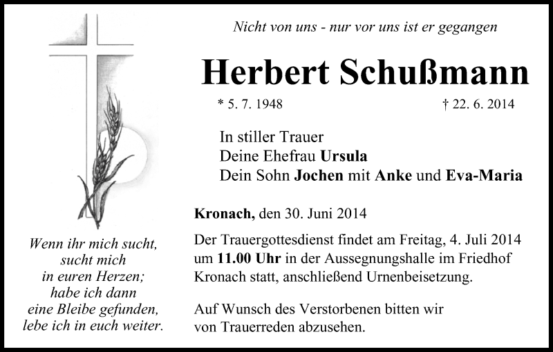 Hier finden Sie alle Traueranzeigen aus der Zeitung, die bisher für Herbert Schußmann erschienen sind. Weitere Traueranzeigen, die in der Zeitung erscheinen, werden hier ebenfalls aufgelistet